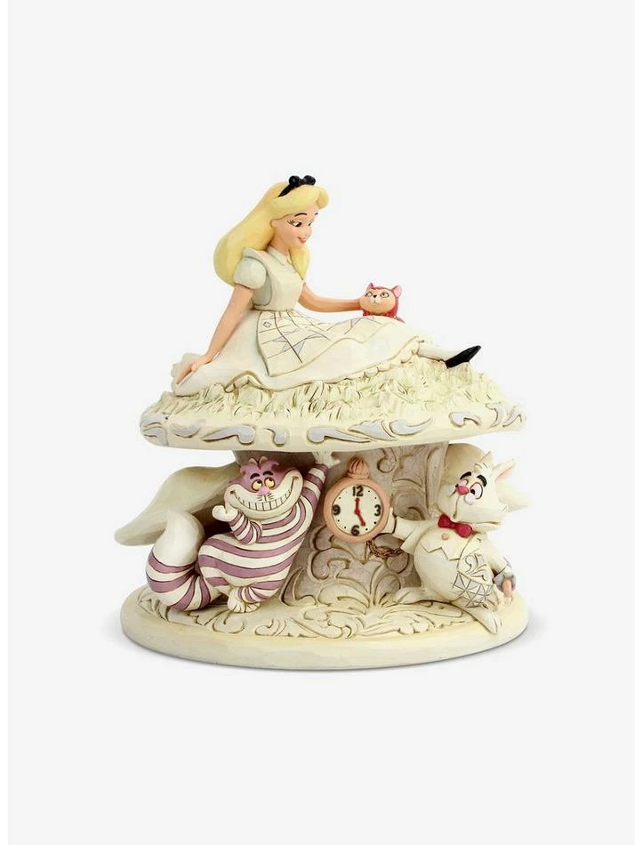 Follow Jim Shore down the rabbit hole to Wonderland in this whimsical figurine. Alice sits with Dinah the cat while Cheshire and the White Rabbit plan their entrance below. Checking his pocket watch, it’s time for the gang to meet.