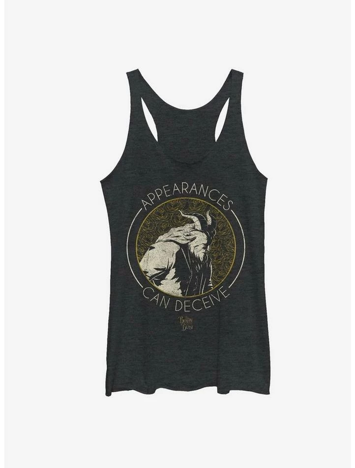 The Beast is hoping you’ll see past his fur and fangs and see the good inside of him. A distressed graphic of the Beast with roses inside the phrase “Appearances Can Deceive” is on the front of this soft black racer-back tank top from Disney’s Beauty and the Beast.