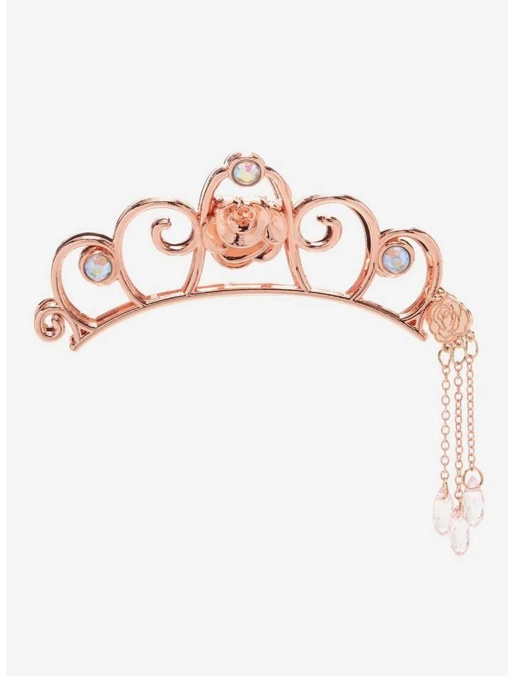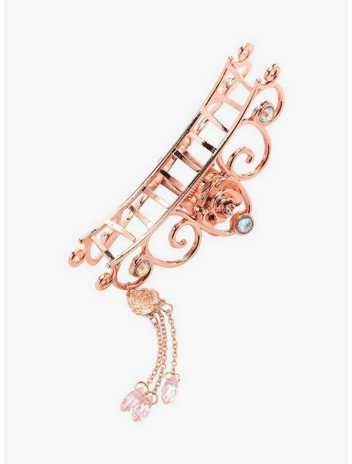 We’re as certain as the sun rising in the east… this claw hair clip is the perfect addition to your Beauty and the Beast collection! Rep your favorite Disney princess with this Belle-inspired crown clip, featuring a rose gold finish with bejeweled gems and a rose at the center and a rose charm with dainty faux crystal chains.