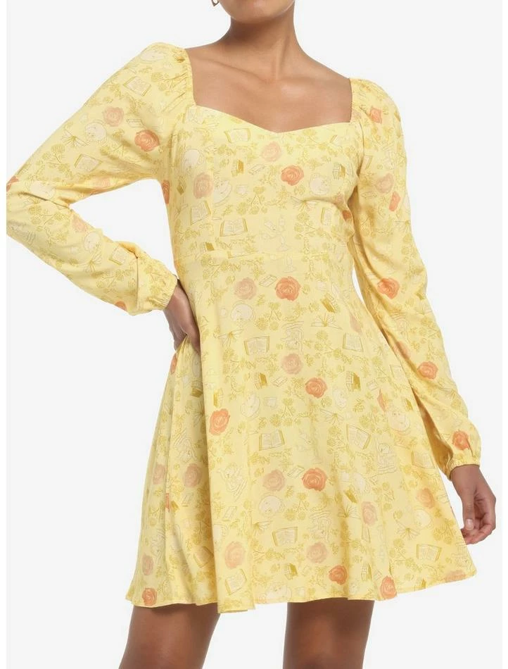 Subtle florals for fall? We love it. Grab this Beauty and the Beast-inspired dress with a sweetheart neckline and long sleeves. It has an allover print of flowers, books and characters like Lumiere, Chip, Mrs. Potts and Cogsworth.