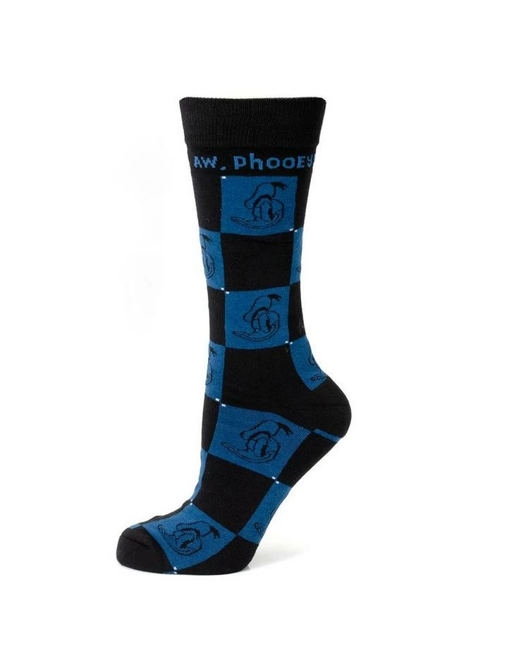 “Aw, Phooey!” Featuring Disney’s excitable duck, these socks are designed with Donald Duck’s head stitched in a Blue and Black checkered pattern. These comfortable, cotton socks will keep your feet cushioned. Officially licensed by Disney.