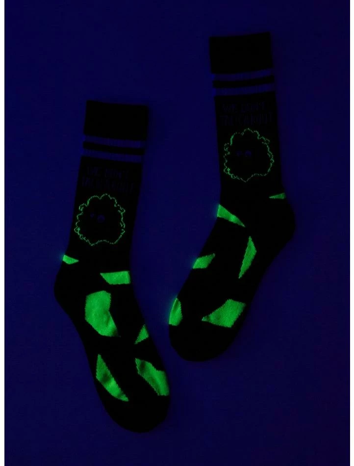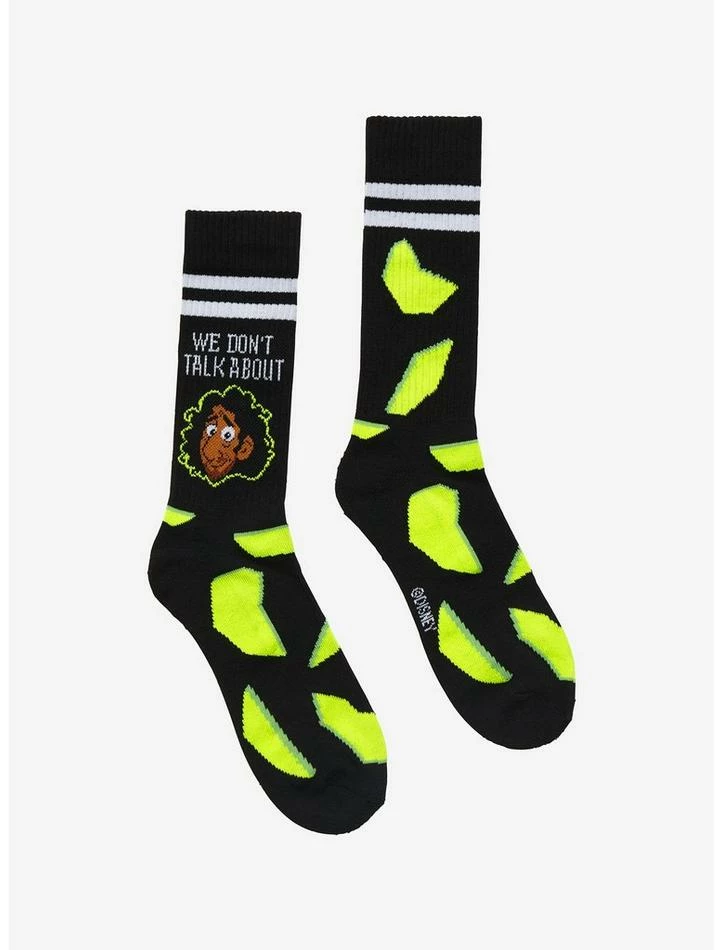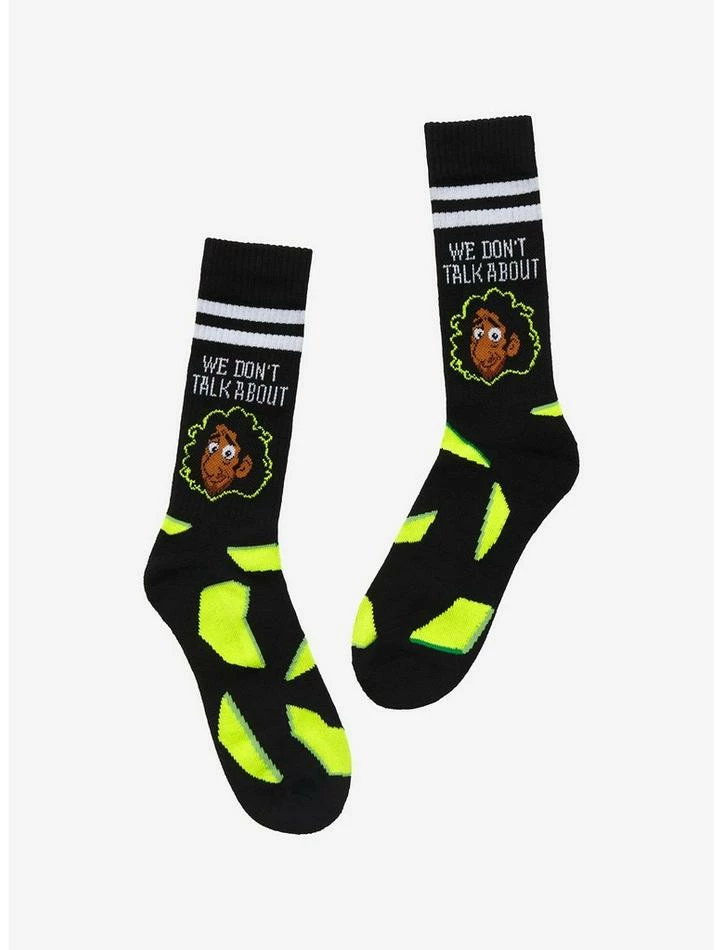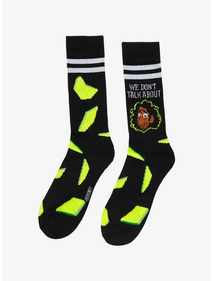 Okay, we won’t talk about Bruno… but we willΒ talk about these socks! Grapple with prophecies with these EncantoΒ crew socks on, featuring Bruno on the outer facing side with “We don’t talk about” up top,Β broken glass fragments falling all around him and varsity stripes up top.