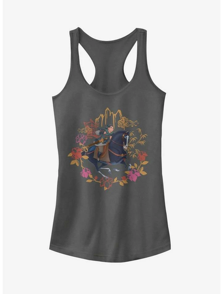 Don’t head out to fight the Hun leader, Shan-Yu, without the Disney Mulan Floral Wreath Juniors’ Racerback Tank Top! Mulan, dressed as Ping, races across this fitted Mulan tank top while a colorful flower wreath encircles her.