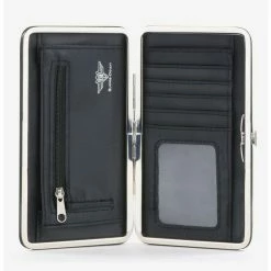 Stylish and sleek, this hinged wallet is made from vegan leather and stainless steel. It measures 7 x 4 x 0.75 inches, with 2 billfolds, 4 card slots, and a windowed ID holder.