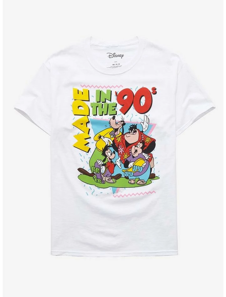 Are you just like Goof TroopΒ and “Made in the ’90s” too? Show it off with this white tee! Printed with your fave characters, a retro background and the text above.