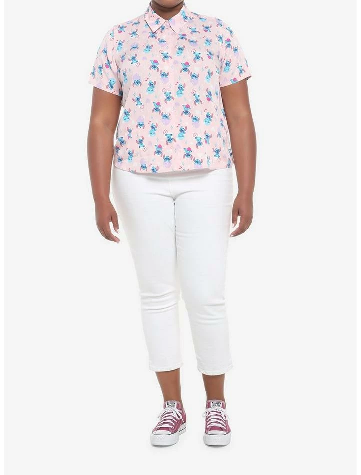 New ๐คฉ Disney Lilo & Stitch Hearts Pink ๐ง Girls Woven Button-Up Plus Size โ๏ธ