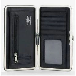 Stylish and sleek, this hinged wallet is made from vegan leather and stainless steel. It features 2 billfolds, 4 card slots, and a windowed ID holder.