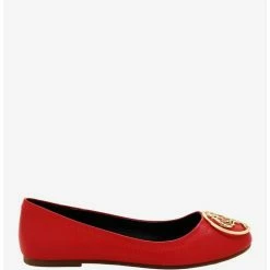 Please bring honor to… your wardrobe! These red faux leather flats will be sure to make a bold statement in your outfit. From Disney’s Mulan, they have a gold metal emblem of Mushu on the toes.