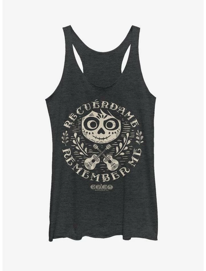 Remember the beauty of Coco with this memorable heather black tank! It features our hero, Miguel, above crossed guitars and a film logo, along with the title of the lullaby, “Recuerdame” (“Remember Me”).