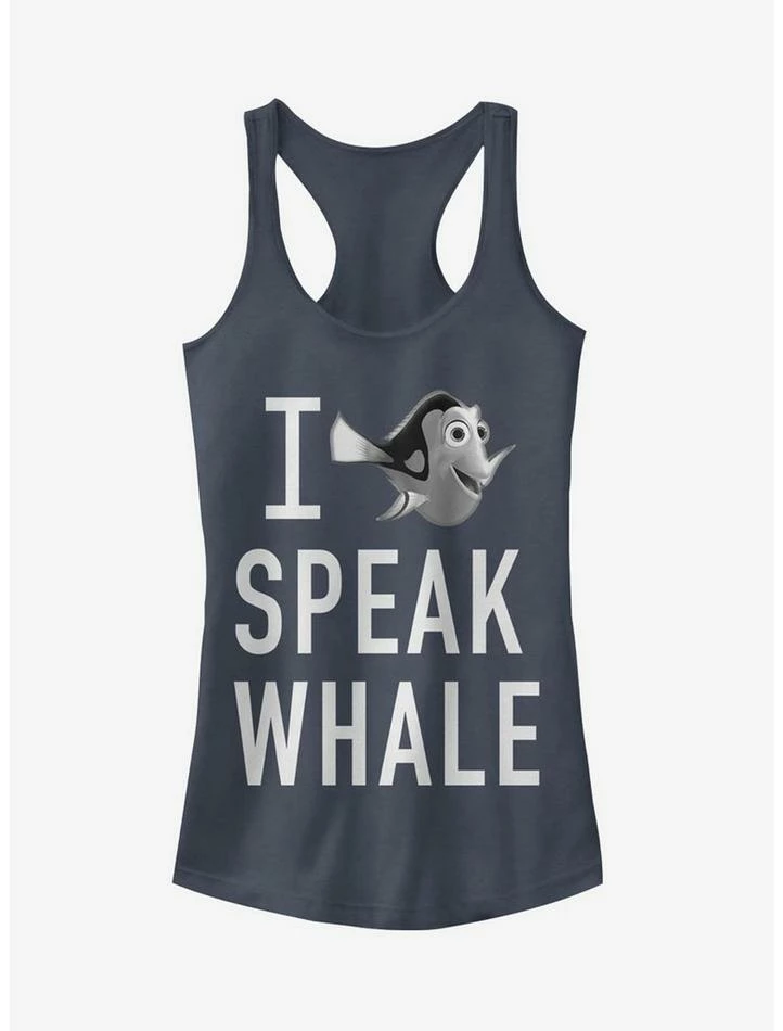 Dory has all sorts of hidden talents like speaking whale AND finding the most stylish fashions available like the Finding Dory I Speak Whale Indigo Blue Racerback Tank Top! The lovable Dory is displayed next to the hilarious declaration “I Speak Whale” down the front of this adorable blue Finding Dory tank top. 60% Cotton, 40% Polyester.