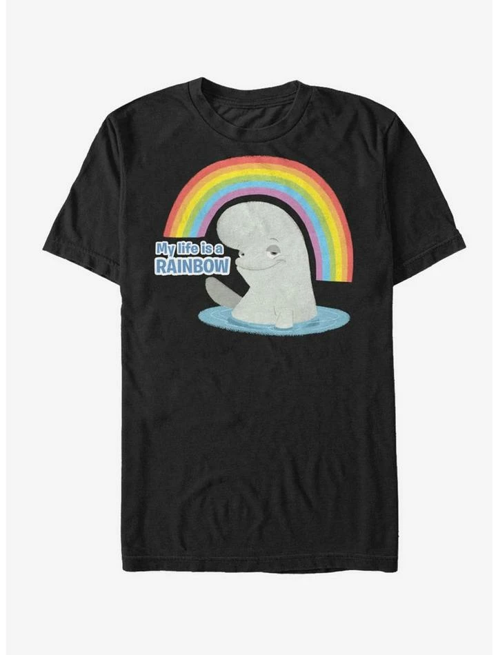 Bailey always sees the bright side of life with the Finding Dory My Life is a Rainbow Black T-Shirt! The smiling white beluga whale, Bailey, is displayed alongside a rainbow and the statement “My life is a Rainbow” printed in a distressed style down the front of this awesome black Finding Dory T-shirt. 100% Cotton.