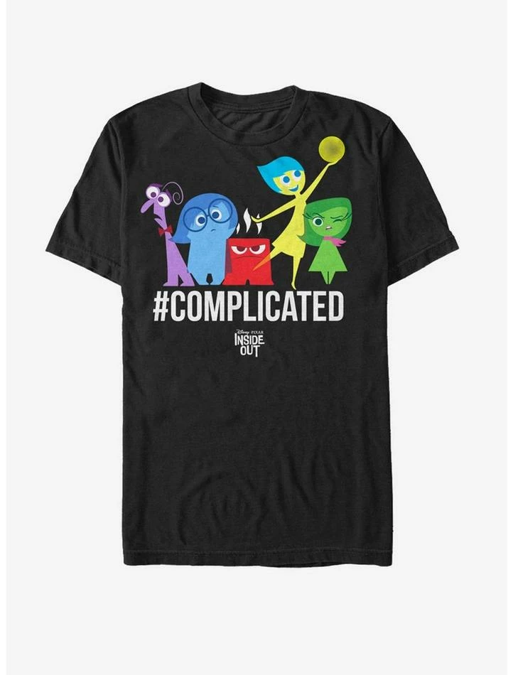 It’s time to start making happy memories with the Inside Out Complicated Emotions Black T-Shirt! Riley’s emotions Fear, Sadness, Anger, Joy, and Disgust are all printed above “#Complicated” on the front of this funny Inside Out T-shirt. 100% Cotton.
