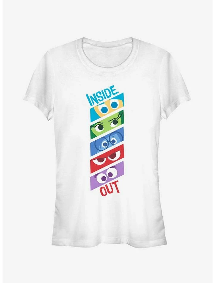 People say the eyes are the window to the soul, but on the Inside Out Emotion Eyes Juniors’ T-Shirt the eyes are more like a window to the brain! Riley’s emotions Joy, Disgust, Fear, Sadness, and Anger are represented by their eyes on this cute fitted Inside Out shirt.