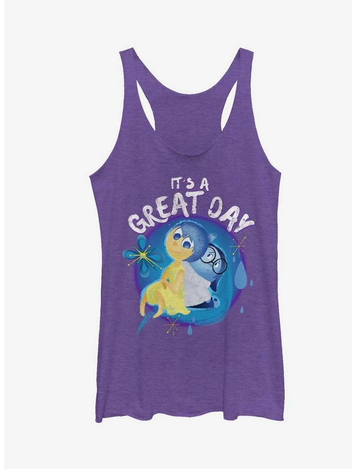 It’s a great day to wear the Inside Out Joy and Sadness Great Day Heather Purple Racerback Tank Top! Help Joy cheer up Sadness with this adorable purple Inside Out tank top that features Joy and Sadness with “It’s A Great Day” in distressed white print across the top. 50% Polyester, 25% Cotton, 25% Rayon.