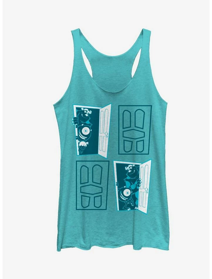 What’s that rattling around behind your closet door? It’s the Monsters Inc. Closet Door Portal Heather Turquoise Racerback Tank Top! Sulley, Mike, and Boo peek out from behind a closet door on this awesome Monsters Inc. shirt. 50% Polyester, 25% Cotton, 25% Rayon.