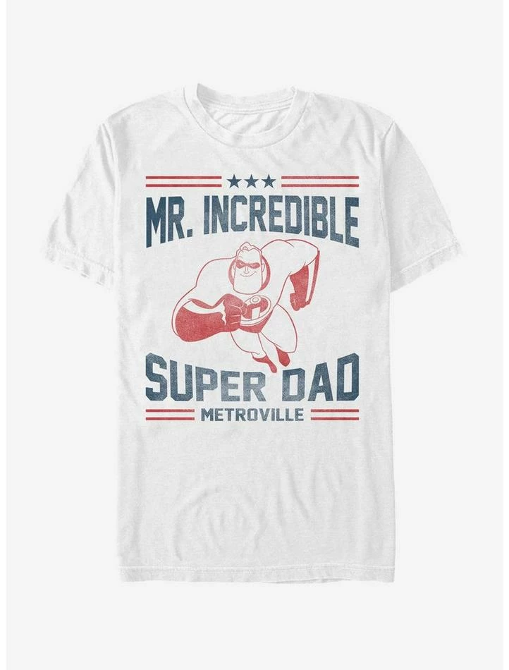 Celebrate the Mr. Incredible in your life with this Incredibles tee! Mr. Incredible is featured in a slightly distressed print that reads “Mr. Incredible Super Dad Metroville” down the front. This shirt is the perfect way to show your dad how incredible he is!