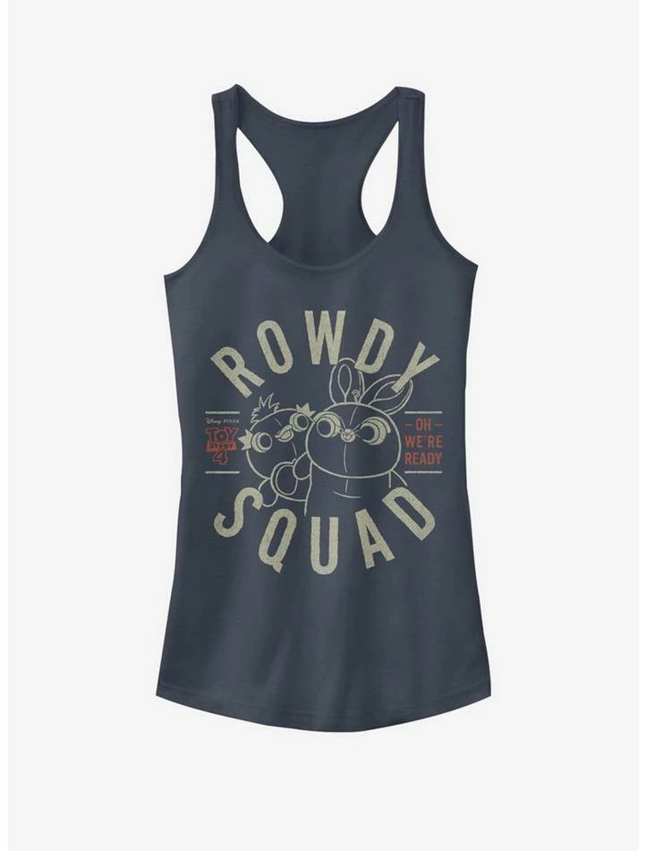 They’re ready. You’re ready. We’re all ready for the next chapter in the Toy Story story! This indigo tank features new characters Ducky and Bunny, with a Toy Story 4 logo, “Rowdy Squad,” and “Oh we’re ready” verbiage.