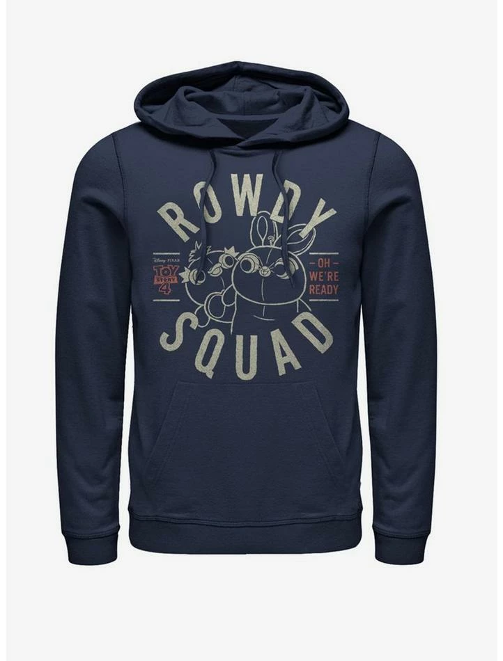They’re ready. You’re ready. We’re all ready for the next chapter in the Toy Story story! This navy blue pullover hoodie features new characters Ducky and Bunny, with a Toy Story 4 logo, “Rowdy Squad,” and “Oh we’re ready” verbiage.