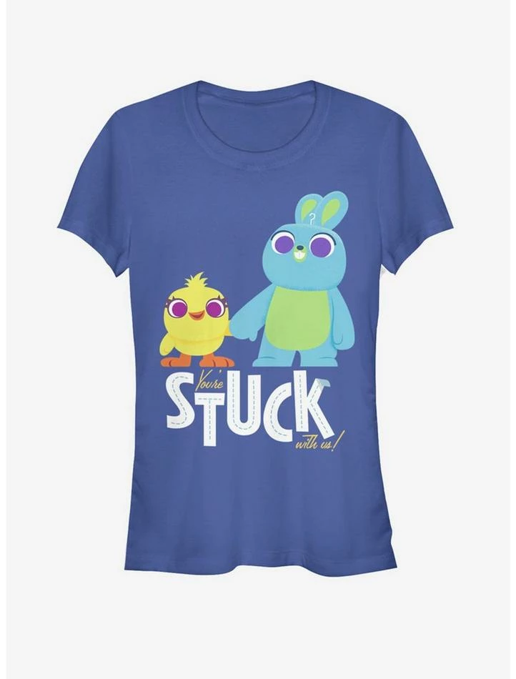 Meet Ducky and Bunny, the new toys from Toy Story 4 you need to know. Oh, and we should probably mention you’re stuck with them – literally – on this fitted royal blue tee. (Could be worse.)