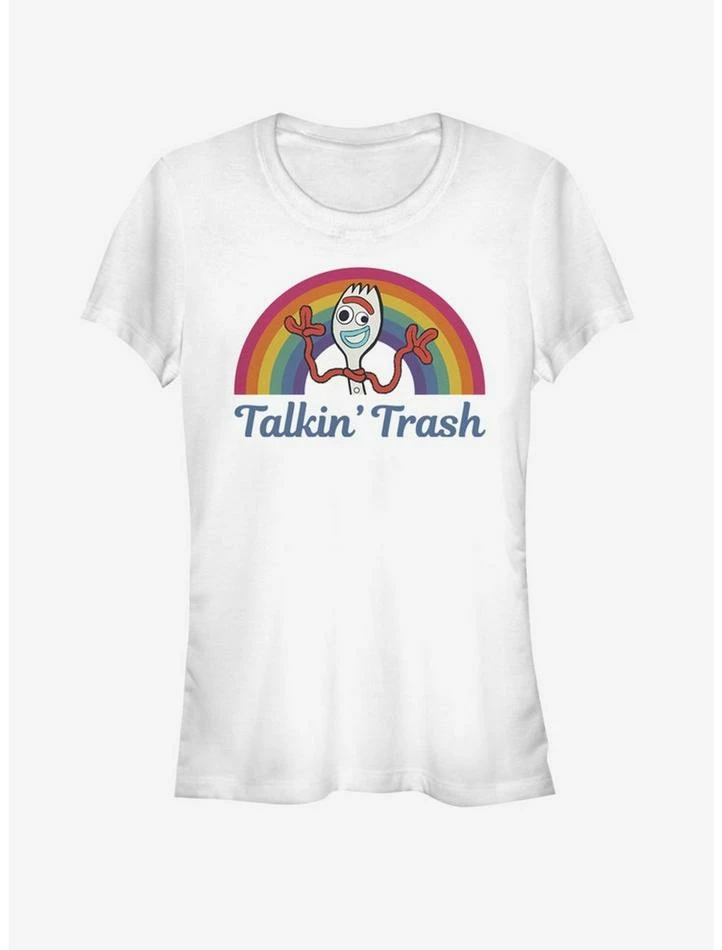 Is Forky a toy – or is he trash? Think about that while you wear this fitted white tee featuring the Toy Story 4 character in front of a rainbow.