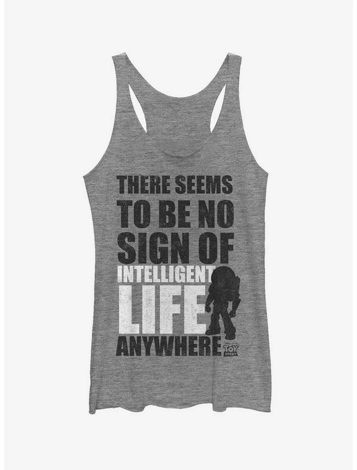 Buzz may not have found any “intelligent life” upon his arrival but he did find the Toy Story No Intelligent Life Silhouette Women’s Racerback Tank Top! Your favorite Space Ranger from the Galactic Alliance is shown with the statement “There Seems to Be No Sign of Intelligent Life Anywhere” in distressed print down the front of this funny Toy Story tank. Designed with raw-edge hems.