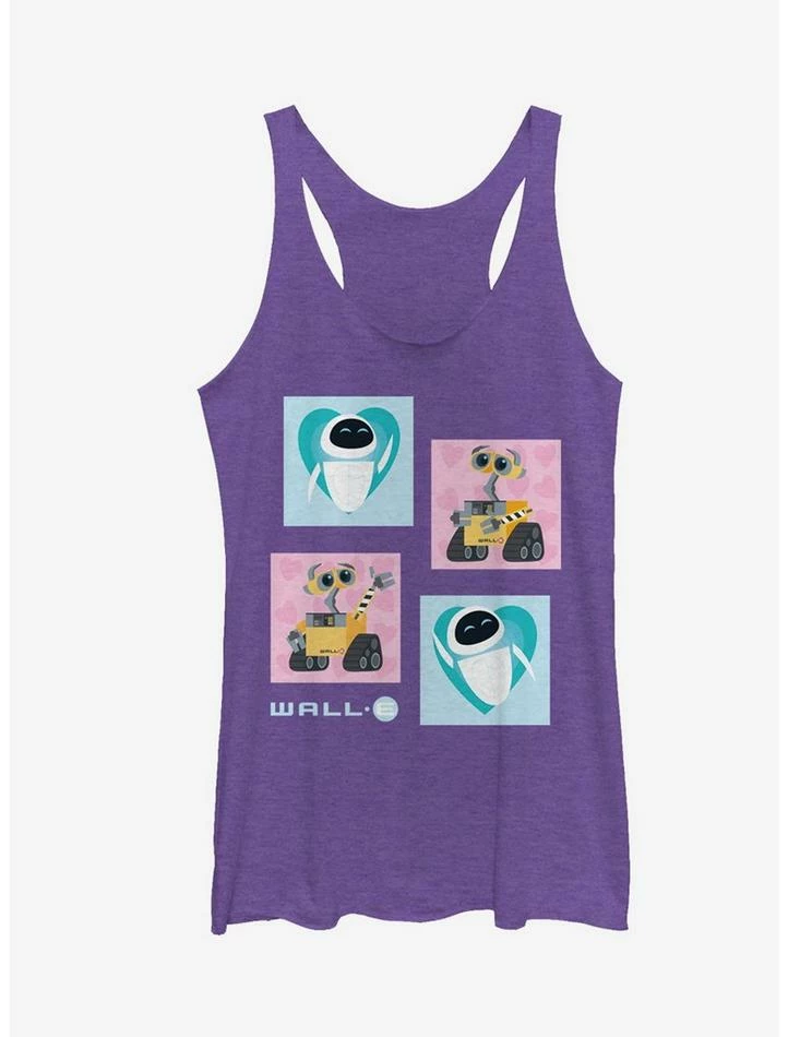 The two sweetest robots in the galaxy are reunited on the WALL-E Robot EVE Heart Heather Purple Racerback Tank Top! Robot besties WALL-E and EVE are printed in four squares with hearts on the front of this cute purple WALL-E shirt. 50% Polyester, 25% Cotton, 25% Rayon. Designed with raw-edge hems.