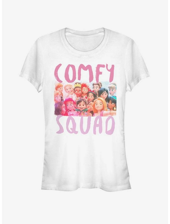 Get comfy and lounge around with your favorite princesses. This white tee from Disney’s Ralph Breaks the Internet features “Comfy Squad” text design and Vanellope’s selfie with the other Disney princesses.