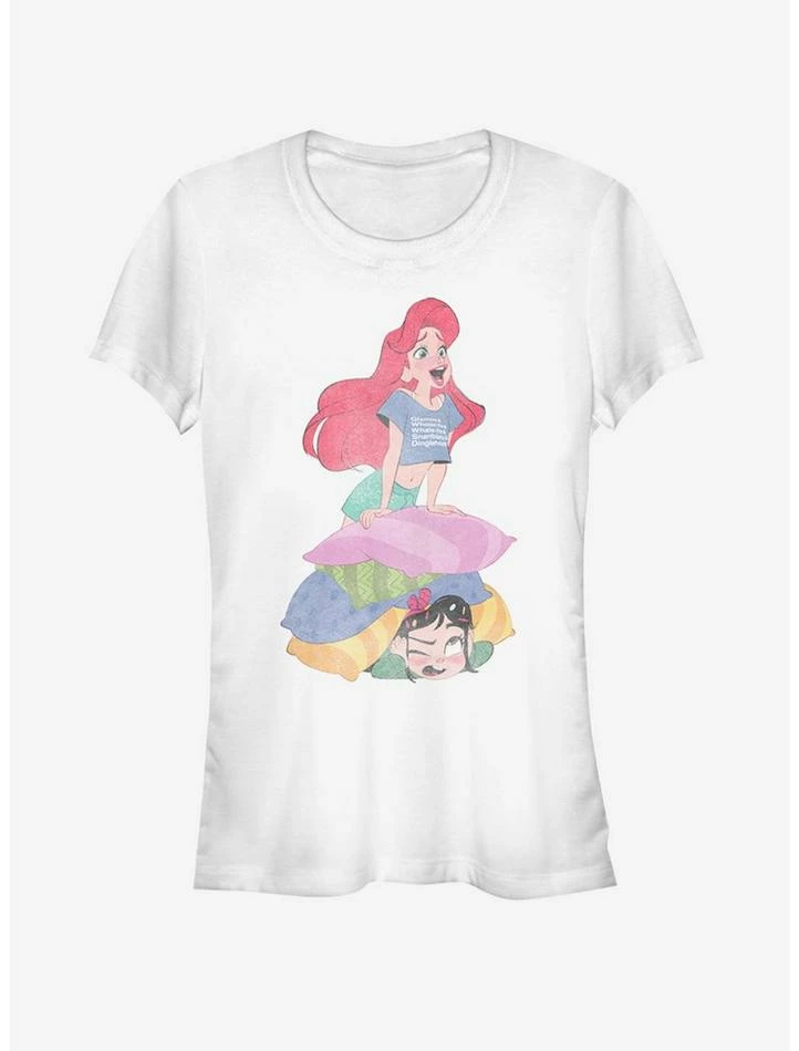 What would a sleepover with the princesses be like without Ariel breaking out into song? This white tee from Disney’s Ralph Breaks the Internet features Ariel singing on top of a stack of pillows with Vanellope trying to block out the noise.