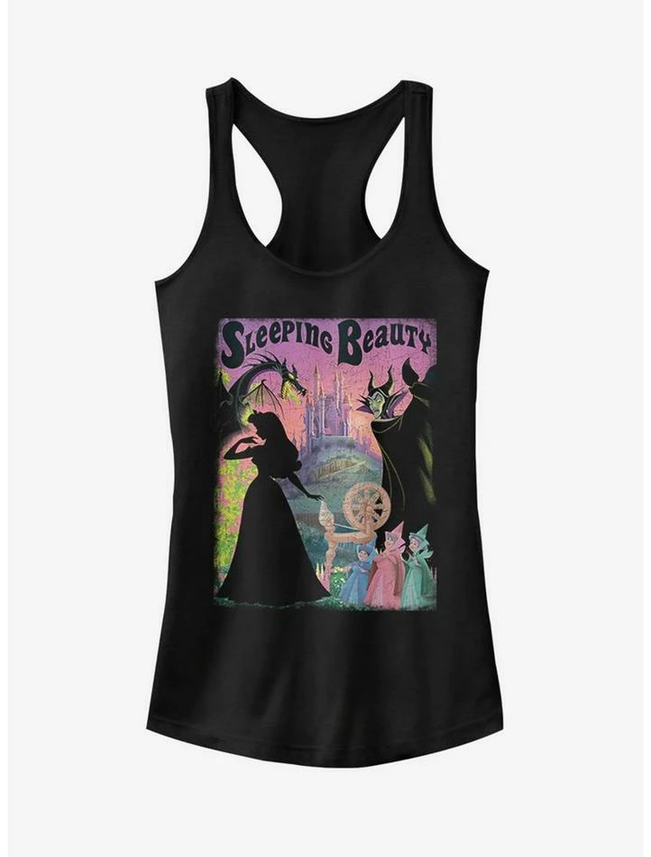 This stunning black tank features vintage poster art from Disney’s Sleeping Beauty, featuring Aurora, Maleficent, Merryweather, Flora, Faunaβ¦ and that spindle.