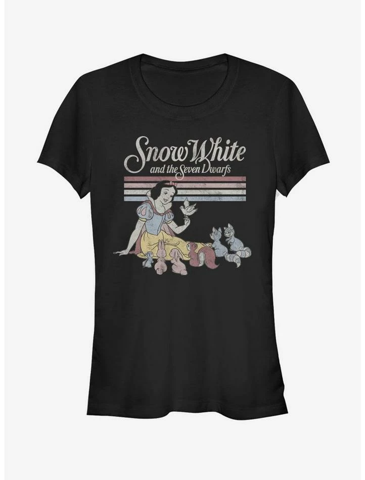 Snow White had a special connection with her forest friends. This fitted black tee, inspired by Disney’s Snow White and the Seven Dwarfs, shows our heroine giving a smile and a song to the lucky woodland creatures in her life.