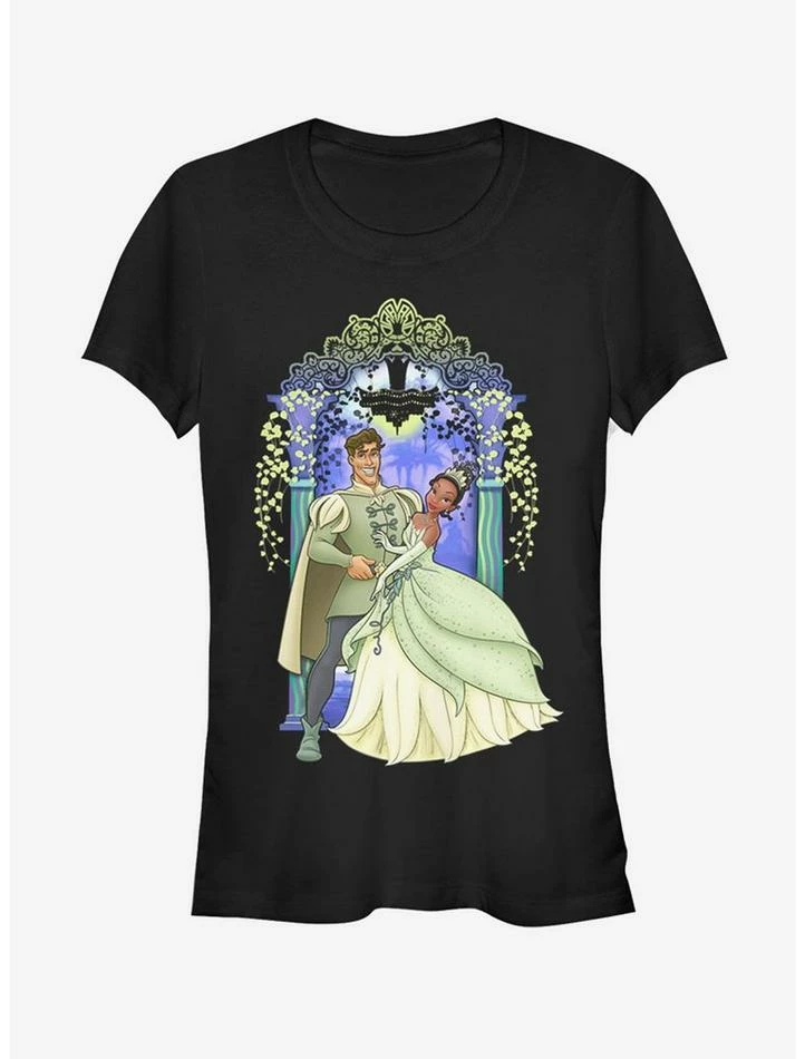 Freed from the curse – and lookin’ fine! This fitted black tee has a front screen featuring one of our favorite couples ever, Prince Naveen and Princess Tiana from Disney’s The Princess and the Frog.