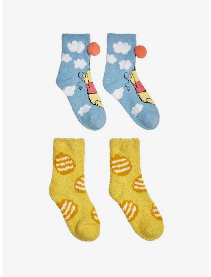 Stay cozy with the help of your Hundred Acre Wood fave! These Winnie the Pooh fuzzy socks feature one pair depicting Pooh flying through the clouds with pom detailing as the balloon. The other pair highlights a toss print of honey jars.