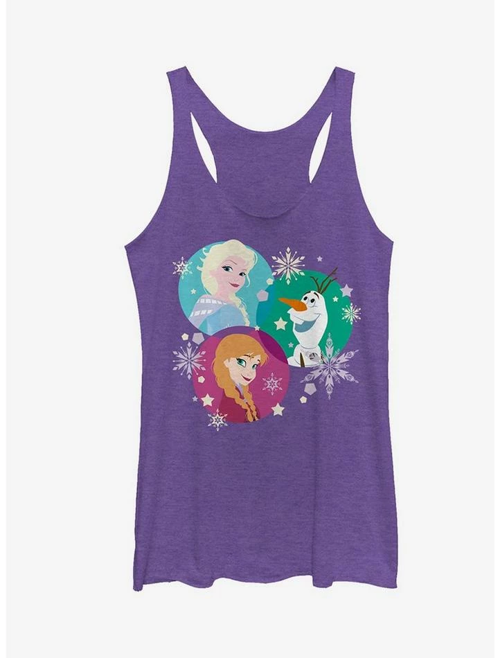 It’s Christmas which means it’s time for snow, snowmen, and the Disney Frozen Character Snowflakes Women’s Racerback Tank Top! Elsa, Anna, and Olaf are printed in colorful frames alongside snowflakes on this cute relaxed fit Frozen tank top.