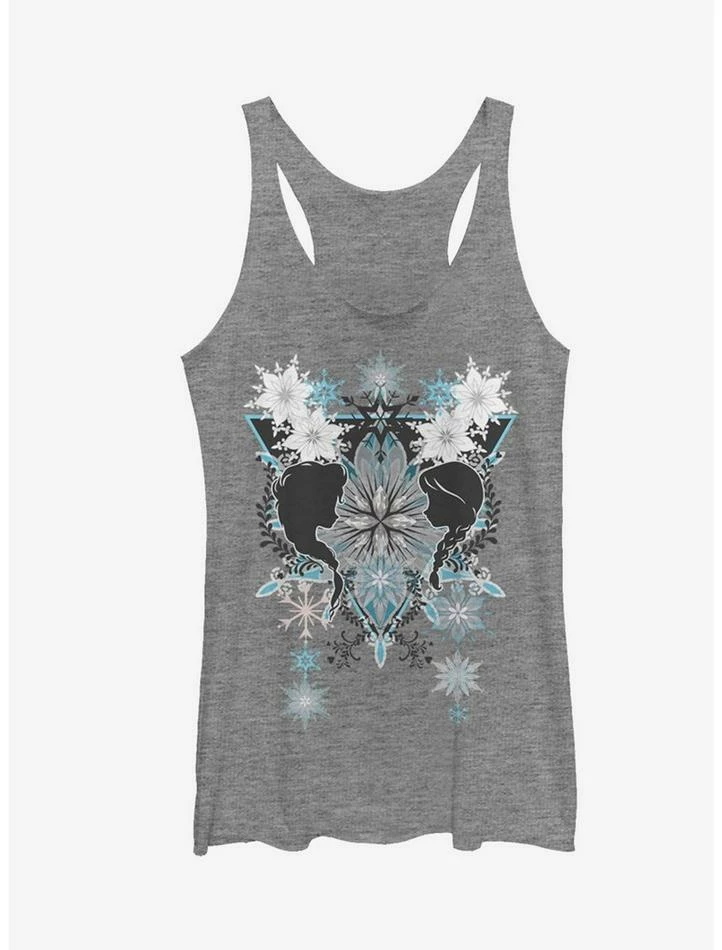 There’s no bond stronger than a sister’s bond! Celebrate sisterly love with the Disney Frozen Sister Snowflake Pattern Heather Gray Racerback Tank Top! A beautiful snowflake pattern frames Elsa and Anna on this cute gray Frozen tank top. 50% Polyester, 25% Cotton, 25% Rayon. Designed with raw-edge hems.