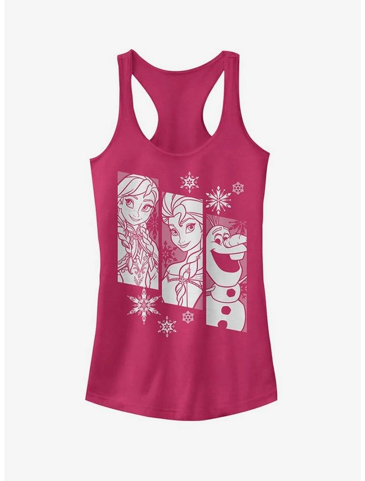 Grab your scarf, your mittens, and your Disney Frozen Trio Dark Pink Racerback Tank Top and head out into the snow for some fun! Elsa, Anna, and Olaf are portrayed in 3 white panels across this adorable fitted pink Frozen tank top. 60% Cotton, 40% Polyester.