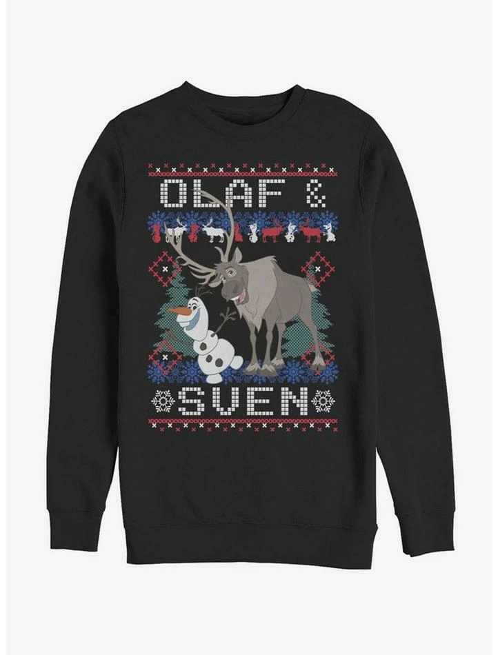 Elsa’s eternal winter won’t feel as cold if you snuggle up with Olaf and Sven on the Disney Frozen Ugly Christmas Sweater Olaf and Sven Black Sweatshirt! Your favorite snowman and reindeer smile out at you from this cute ugly Christmas sweater style sweatshirt that reads “Olaf & Sven” alongside Christmas trees and snowflakes! 50% Cotton, 50% Polyester.