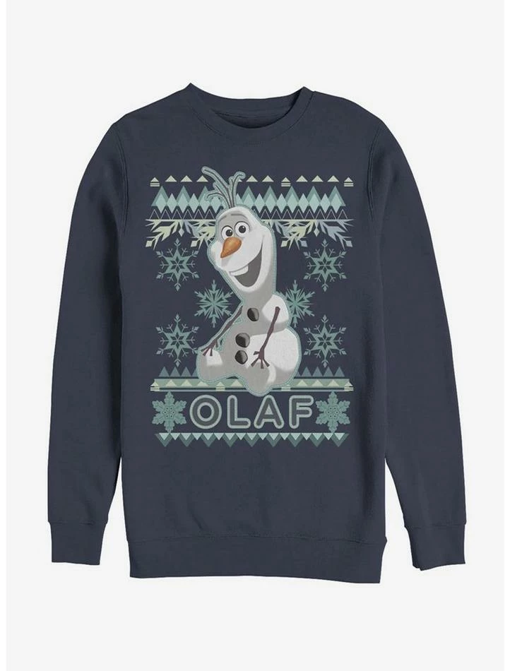 Do you want to build a snowman? Well be sure to bundle up in the Disney Frozen Ugly Christmas Sweater Olaf Navy Blue Sweatshirt first! Your favorite summer-loving snowman, Olaf, is framed in an ugly Christmas sweater print and grins out at you from this blue Olaf sweatshirt. 50% Cotton, 50% Polyester.
