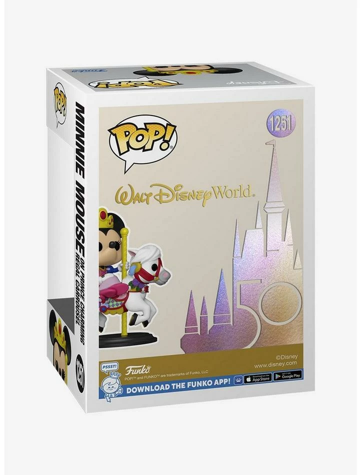 Celebrate 50 years of magic at the Walt Disney World Resort by commemorating one of its beloved theme park attractions! Pop! Minnie Mouse on Prince Charming Regal Carrousel is ready to take a spin through Fantasyland as she wears her royal princess outfit. Join Pop! Minnie for a whimsical ride as she gallops into your Disney Parks collection.