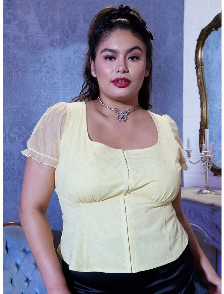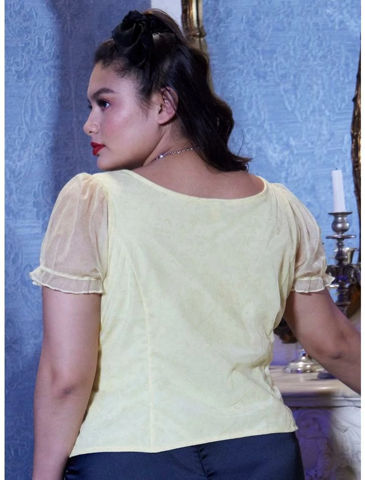 Whether you’re on your way into the provincial town or to the Beast’s castle, dress to impress with this bustier top! From Beauty and the Beast,ย this square neck top has a tulle outer layer with a muted, allover design featuring the enchanted objects and roses. Comes with ruched cinching under the bust, princess seams at the front and back, plus sheer puffy sleeves. Hook and eye closures down the front for a royal touch!