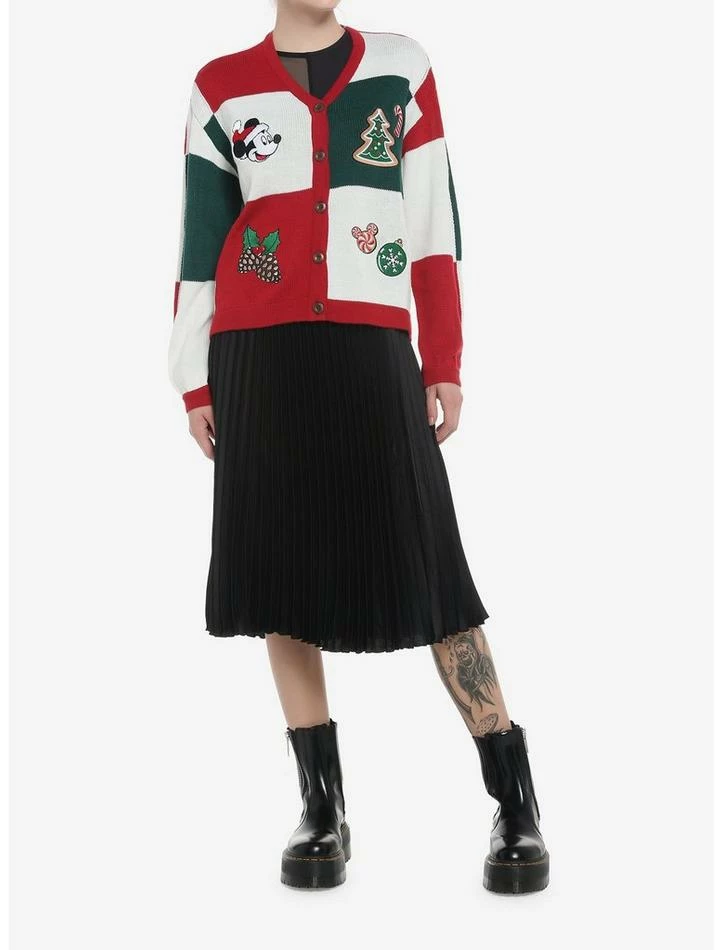 Keep your wardrobe merry and bright this holiday season! Mickey Mouse is here to spread some Christmas cheer with this patchwork cardigan. Stay warm and cozy by the fireside with this oversized slouchy cardi, featuring embroidery of Mickey Mouse in a Santa hat and other magical holiday icons all over the front. Comes with rustic wooden buttons down the center.