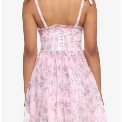We’ve seen this dress once upon a dream, and now it’s a reality! Made pink by Flora, this Sleeping Beauty sweetheart dress features a soft tulle layer over a full skirt, and has an allover design of Princess Aurora, roses, thorns and other icons from the film. Comes with princess seams at the bust, self-tie ribbon straps and lace-up detailing at the back to adjust sizing. Side zipper closure.