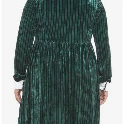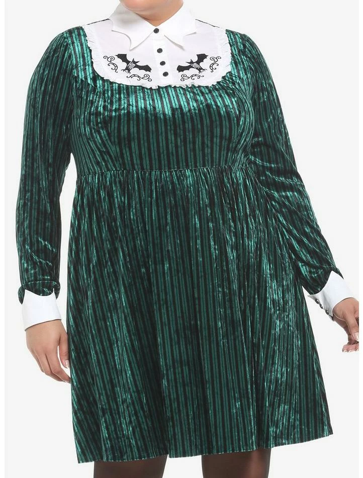Clothe your cadaver in thisย The Haunted Mansionย piece that gives us pure ghoulish delight! Inspired by the ever grim Ghost Host, this velvet dress features a black and green striped design and a ruffled bib highlighting embroidered bats and filigree. Comes with a bat wing collar and cuffs, plus side seam pockets.