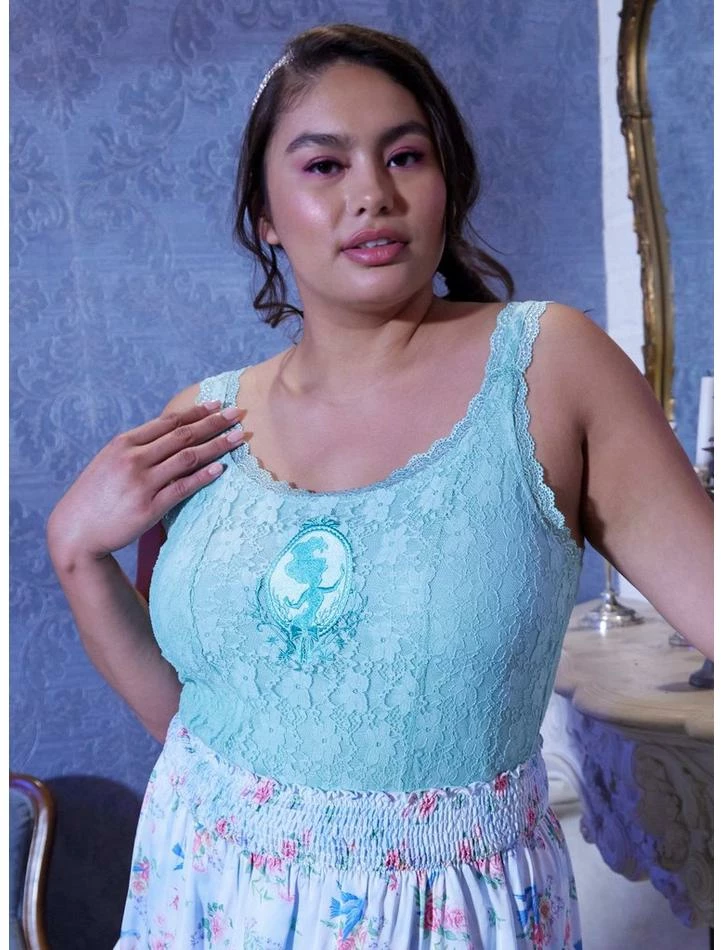 We’ll trade all our dinglehoppers for this top from the human world! Rep the royal Atlantica while you’re up on land with this skimmer length tank top from The Little Mermaid, featuring princess seams down the front and an outer lace layer with scalloped detailing along the neckline and straps. A patch of Ariel’s silhouette is at the center chest, framed by sea life and dinglehoppers.