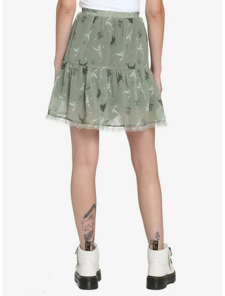 Be the most fashionable fairy at Pixie Hollow (aside from Tinker Bell) in this gorgeous flounce skirt! It comes lined with a see through top layer, featuring a toss print of Tinker Bell striking poses, her silhouette, needle and thread and bells. The moss green color complements Never Land’s foliage, plus it comes with a half elasticated waistband, lace trimming and side seam pockets.