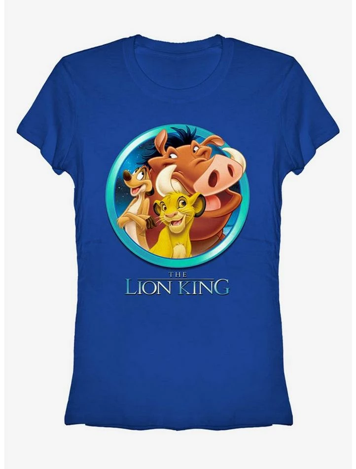 Relax in the jungle with Simon, Pumbaa, and Timon and the Lion King Best Friends Royal Blue T-Shirt! The unstoppable trio: a young Simba, Timon, and Pumbaa are the stars of this awesome fitted blue Lion King shirt. 100% Cotton.