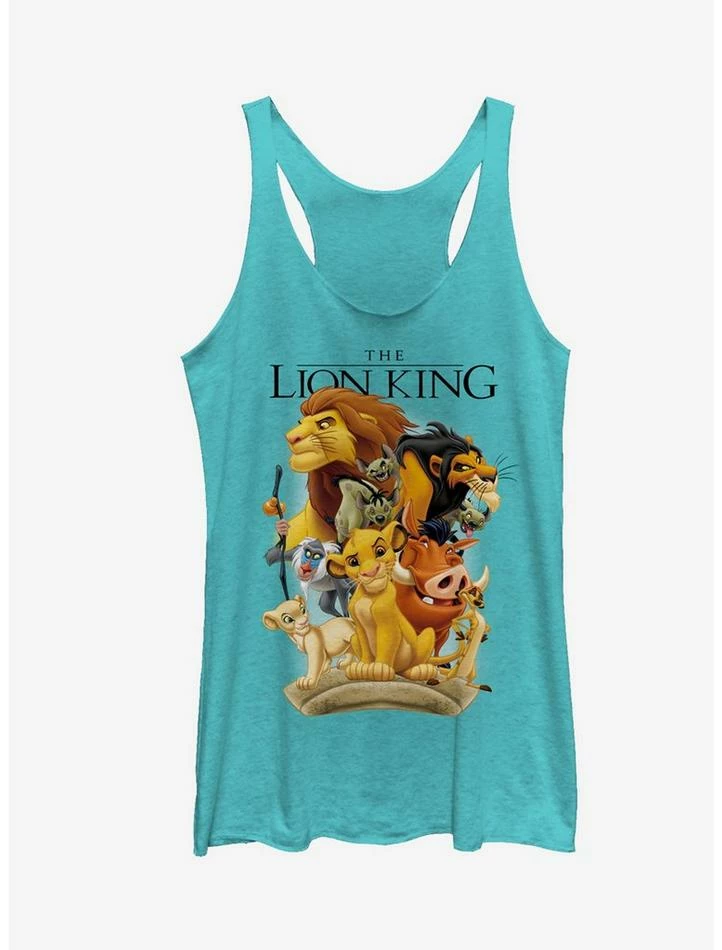Celebrate your love for all things Lion King with the Lion King Pride Land Characters Turquoise Racerback Tank Top. All of your favorite characters…and not so favorite characters…like Mufasa, Scar, Rafiki, young Simba, young Nala, Timon, Pumba, Shenzi, Banzai, and Ed are featured down this cool turquoise Lion King tank top. 50% Polyester, 25% Cotton, 25% Rayon. Designed with raw-edge hems.
