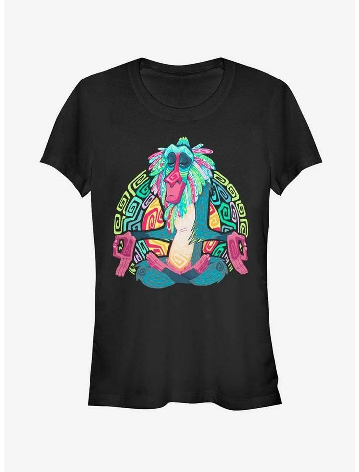 Rafiki is always in tune with both the world around him and the Disney Lion King Rafiki Geometric Rainbow Black T-Shirt! Simba’s wise royal advisor meditates and is portrayed in an epic colorful style on this fitted black Lion King shirt. 100% Cotton.