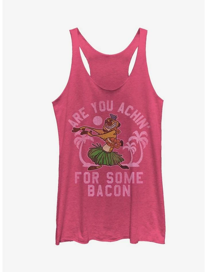 Timon may love grubs but that doesn’t mean he can’t appreciate your love for bacon too on the Lion King Timon Achin’ for Bacon Pink Racerback Tank Top! Timon hula dances across this hilarious soft pink Lion King tank top with “Are you Achin’ For Some Bacon” printed down the front. 50% Polyester, 25% Cotton, 25% Rayon. Designed with raw-edge hems.