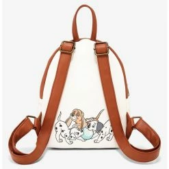 Make sure your bag is full of dog treats for these cuties! Your favorite Disney dogs are featured on this mini backpack, with Lady and the Tramp up top, and Copper with some 101 Dalmatians pups on the front zipper pocket and back side. Comes with a light bone pattern printed in the background. Adjustable straps, interior drop pocket and antique brass tone hardware.