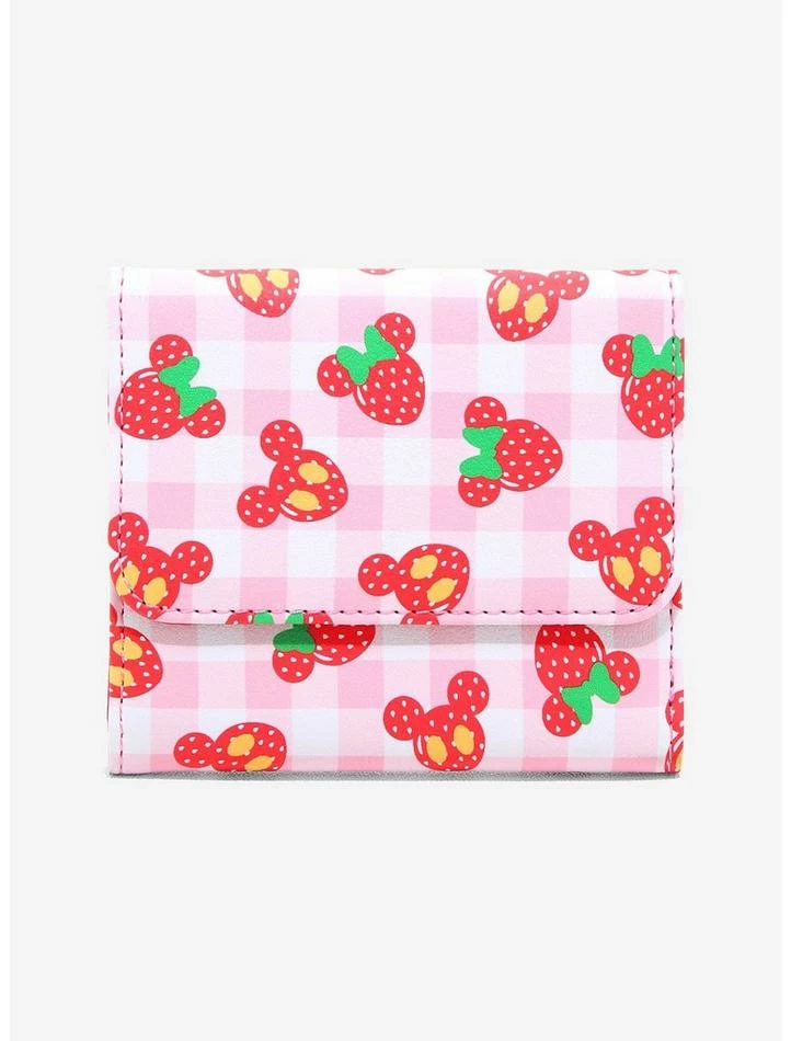 Carry around your essential cards in a berry cute way! This Disney mini flap wallet features a pink gingham pattern and an allover print of strawberries shaped like Minnie Mouse and Mickey Mouse. Comes with 6 card slots, a billfold and a snap-button closure.